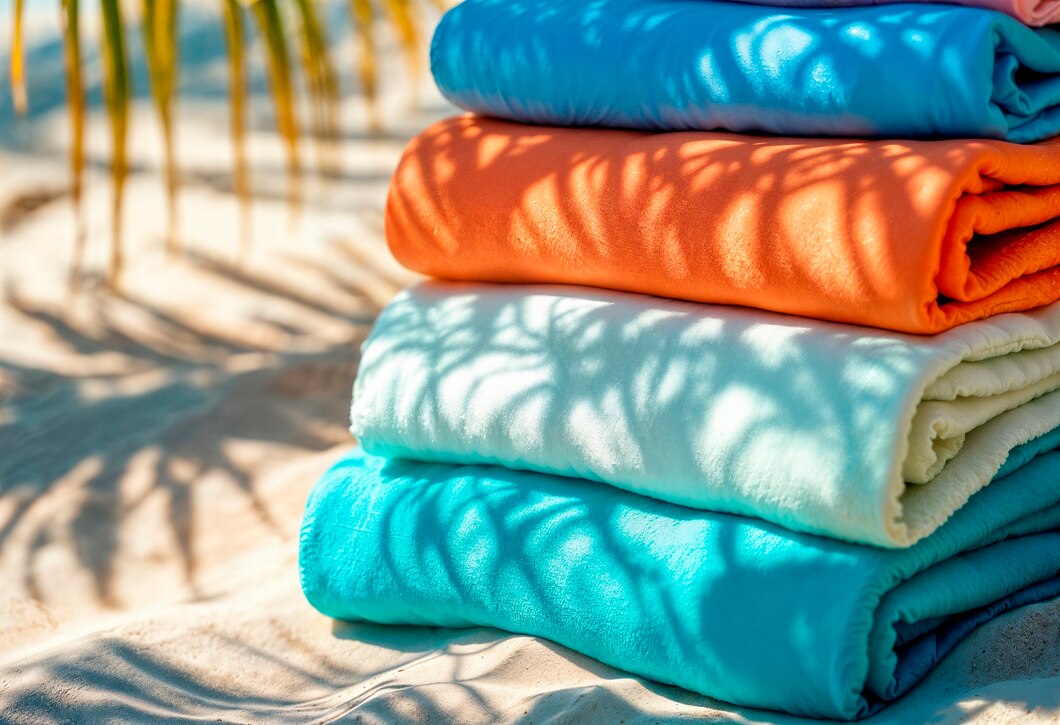Large, vibrant beach towels offering comfort, excellent absorbency, quick drying, durability, and easy portability outdoors.