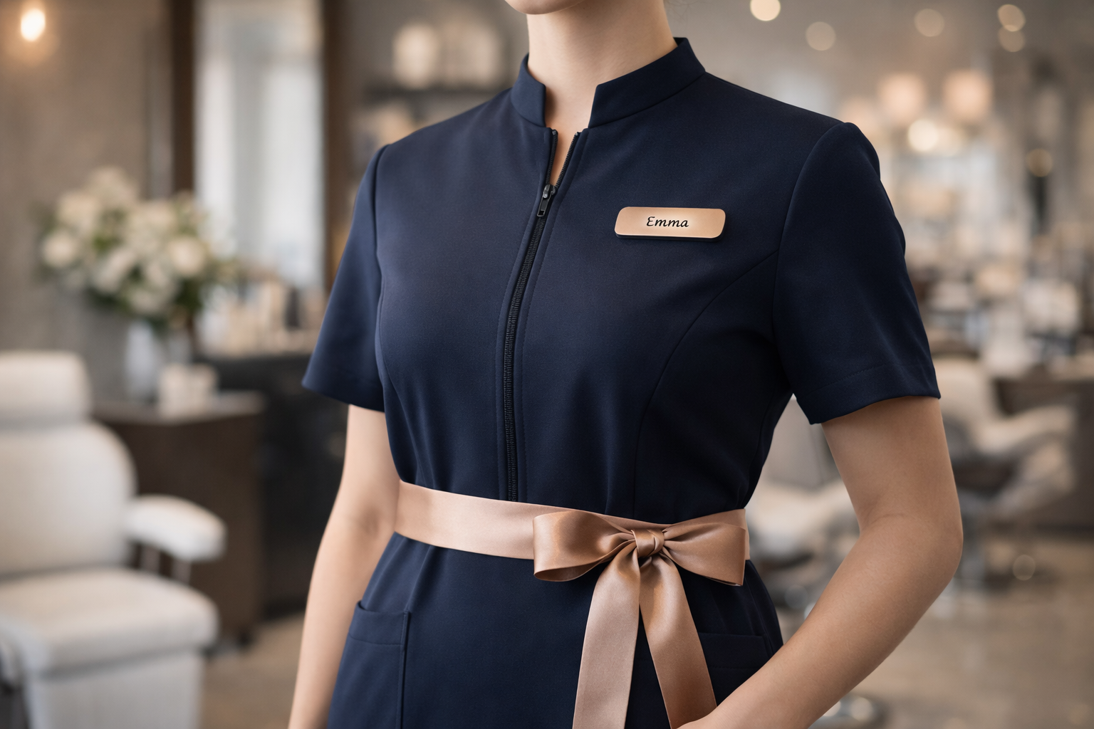 scrub suits, suits, tunic dresses, shirts, trousers, skirts, and name badges designed to give salon and spa staff a stylish, comfortable, and professional appearance.
